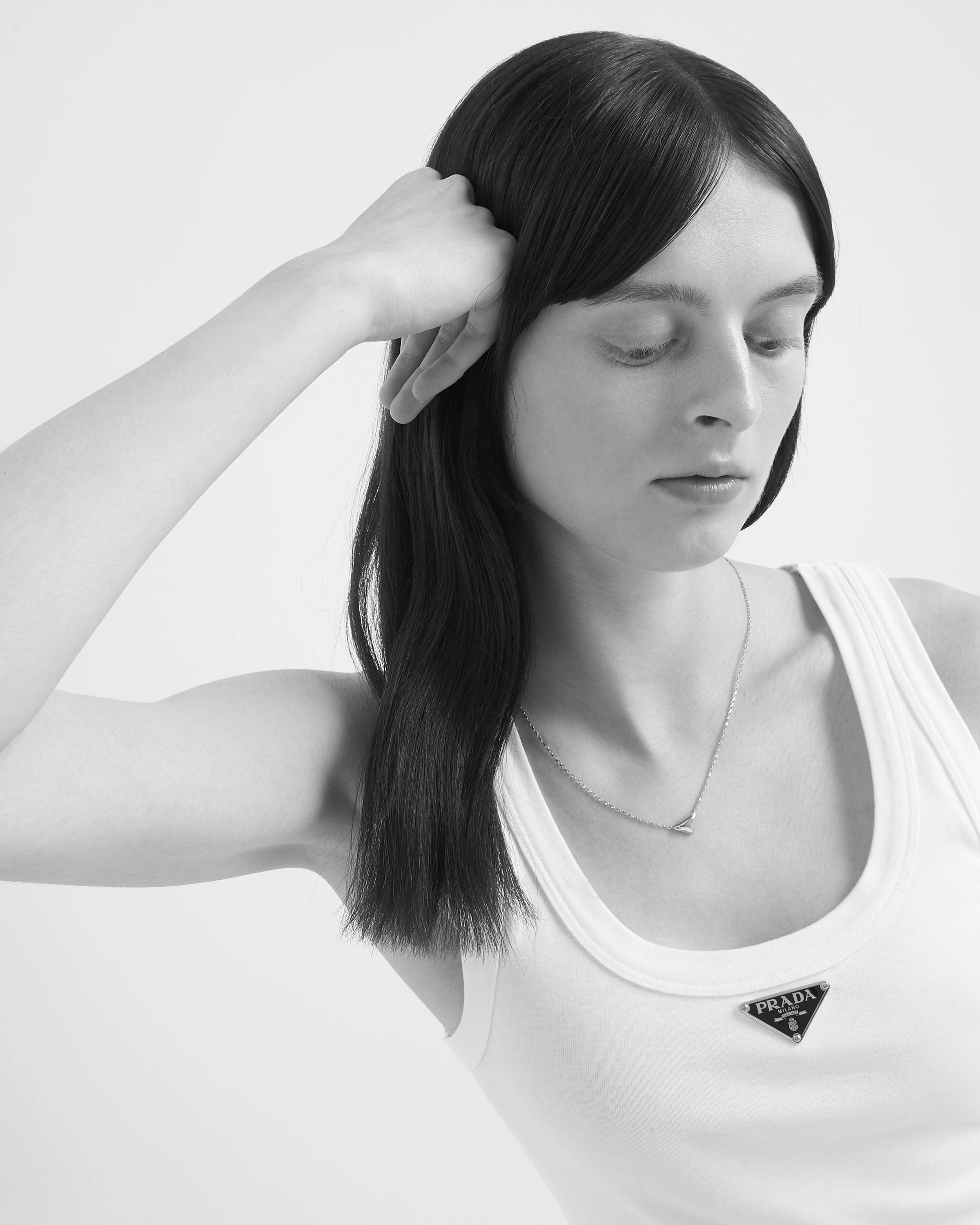 プラダを象徴する要素であるトライアングルが特徴的なファインジュエリーコレクション。1913年に創業者のマリオ・プラダがトランクに初めてデザインした象徴的なトライアングルロゴを再解釈したミニペンダントをあしらった、ピンクゴールドのネックレス。独自性とクラフツマンシップのノウハウの親和を目指した絶え間ない対話のなか、プラダのタイムレスな伝統と異なるコンセプトが融合した個性が光る洗練されたジュエリー。