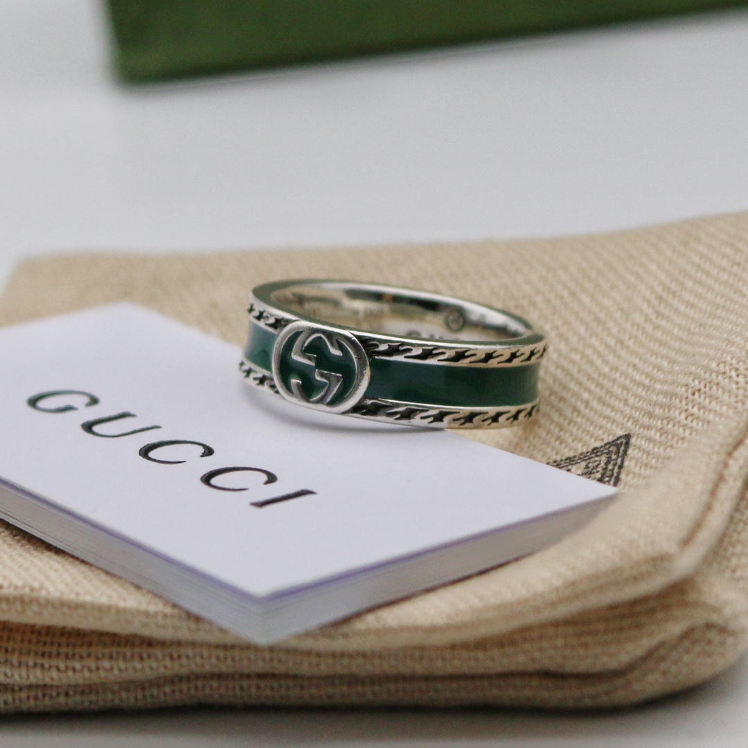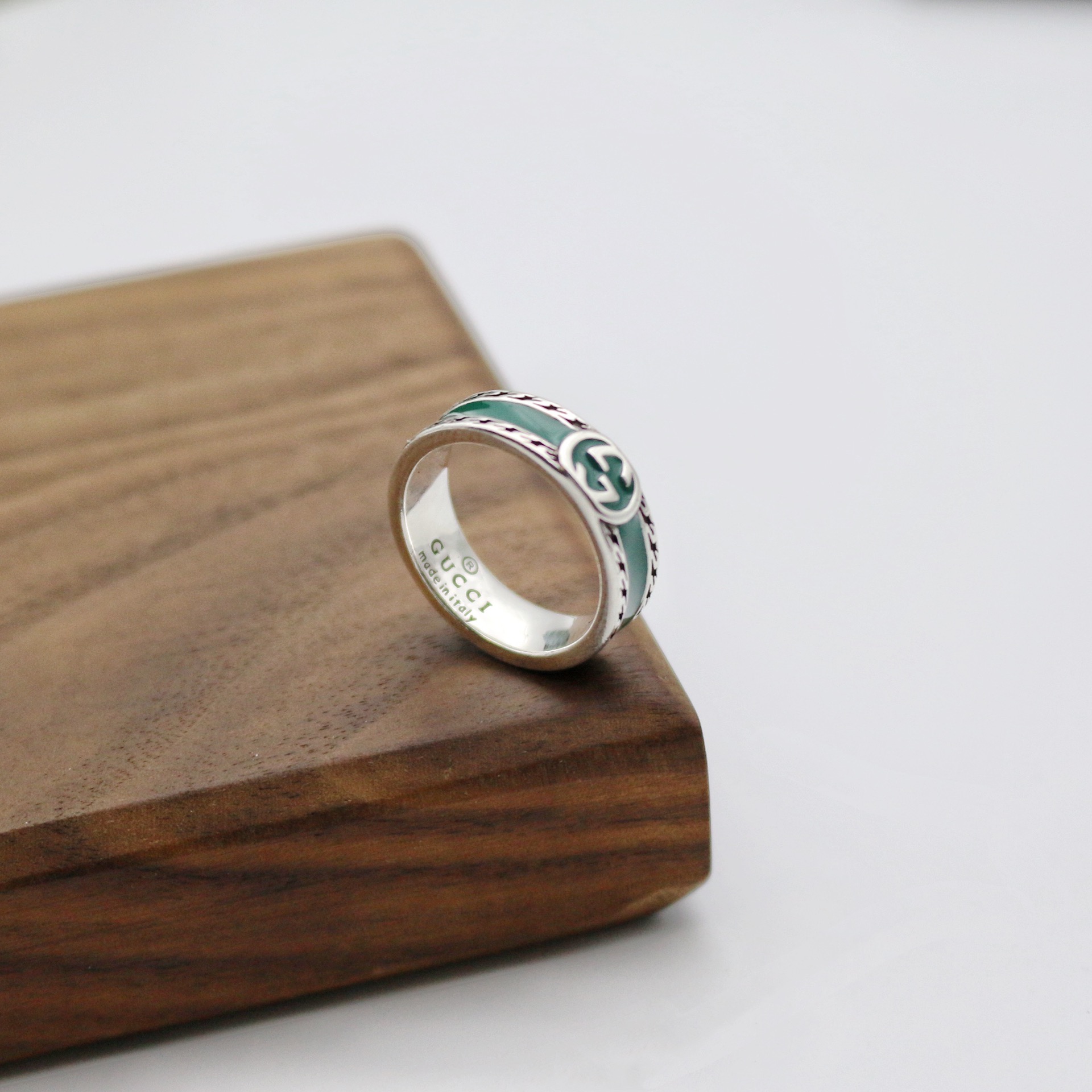 ブランドの創設者グッチオ・グッチのイニシャルを表すインターロッキングGをモチーフとしたシルバー リング。色鮮やかなターコイズのエナメルを施し、テクスチャードトリムで仕上げました。タイムレスなものづくりへの姿勢を打ち出しているEpilogueコレクションでは、グッチを象徴するシンボルに光を当てています。