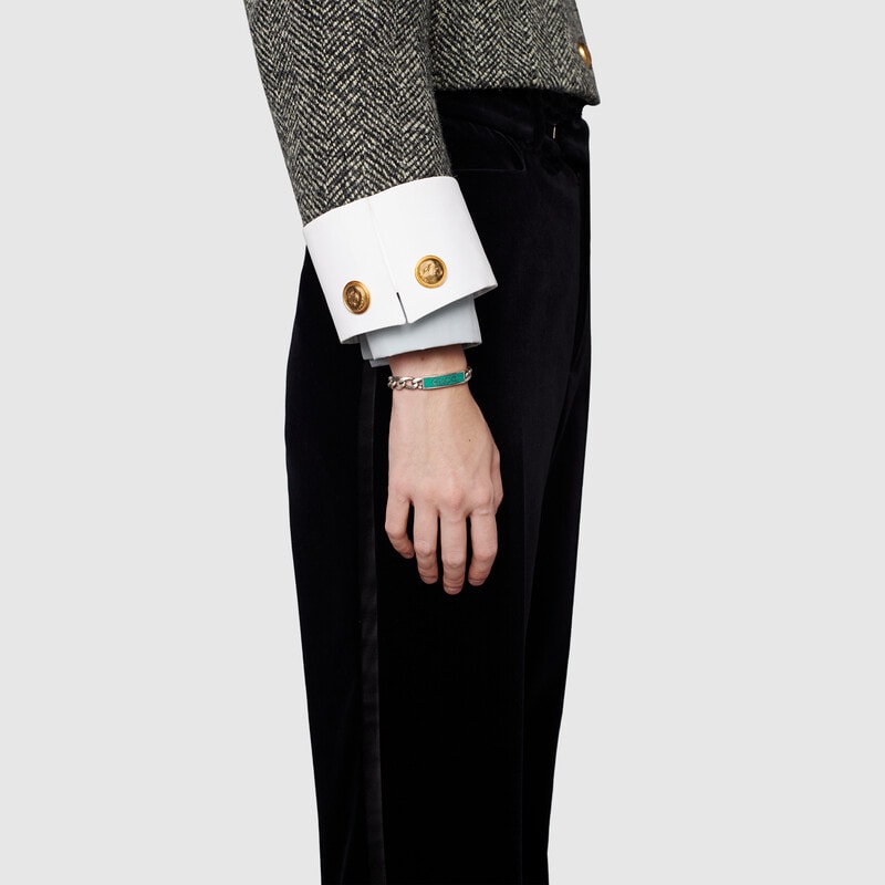 製品詳細このスターリングシルバーブレスレットは、グッチのロゴとサファイアグリーンのエナメルのディテールが特徴です。 明るく活気のあるトーンと大胆なカーブチェーンが互いに補完し合い、モダンな意味でエレガンスを醸し出しています。