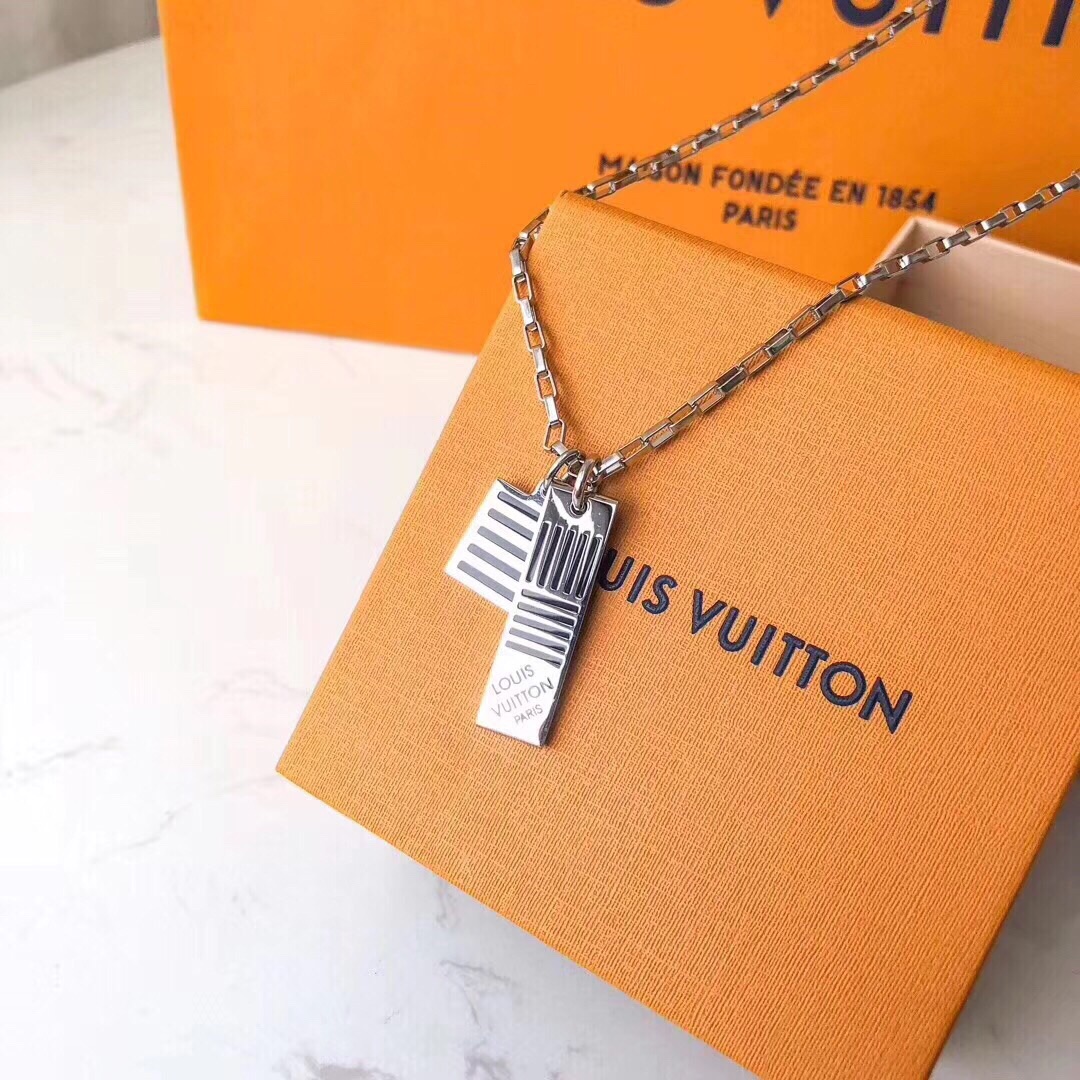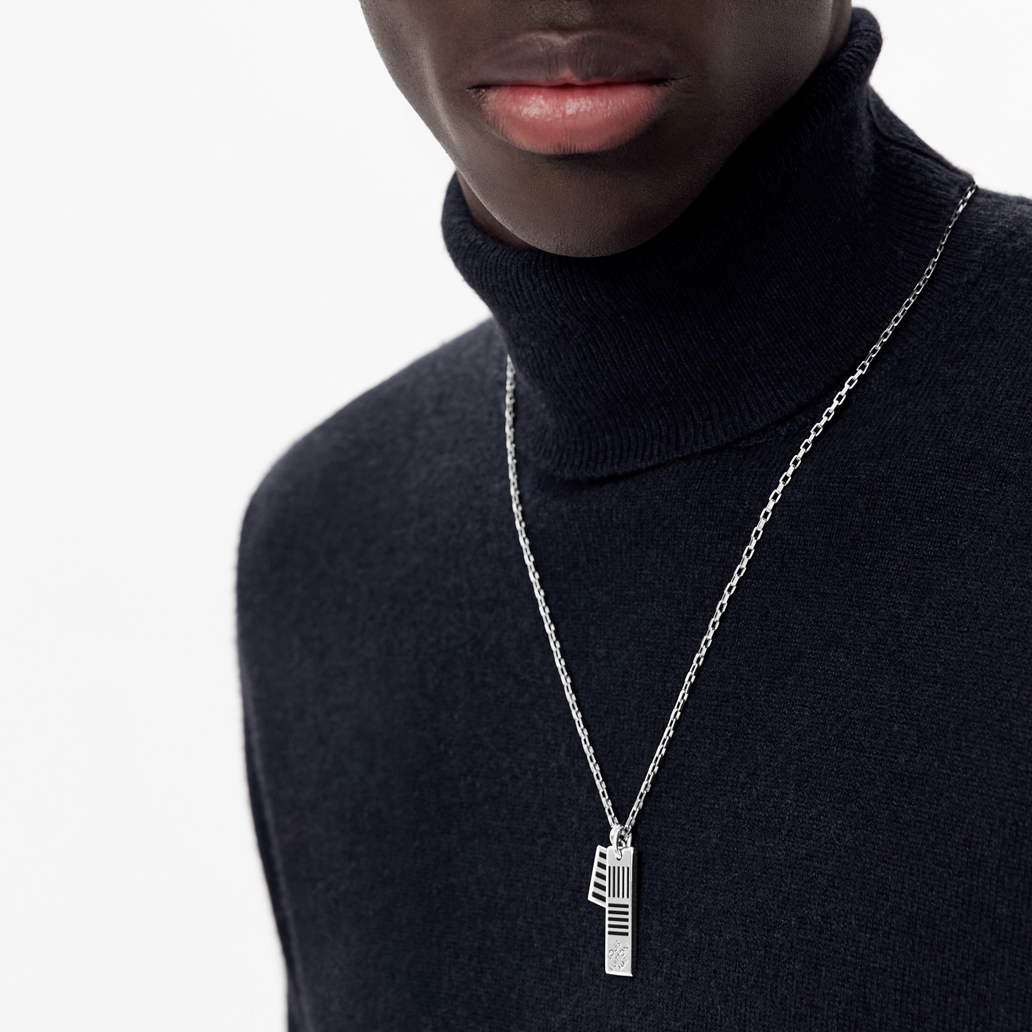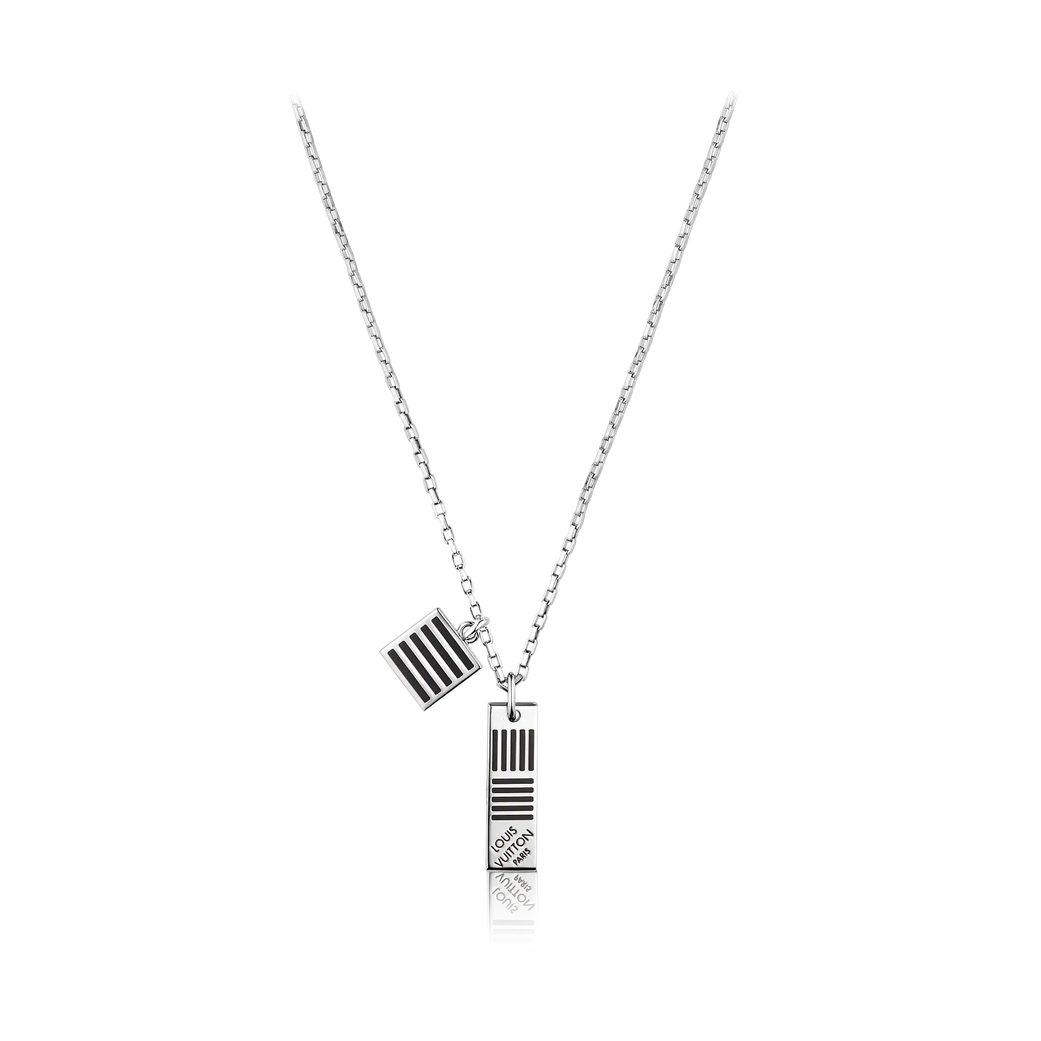 象徴的なダミエチェックの新しい解釈であるこのエレガントなネックレスは、ブラックエナメルとパラジウム仕上げのタフなスタイルを表現しています。 両面デザインは、ダミエチェック柄とルイヴィトンの英語の文言の両方を表示でき、さまざまな方法で着用できます。