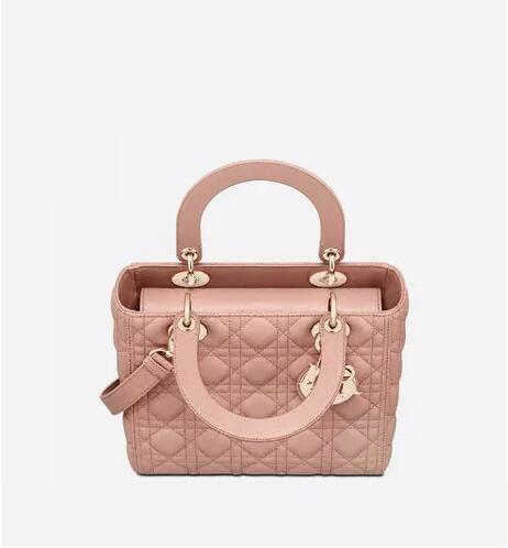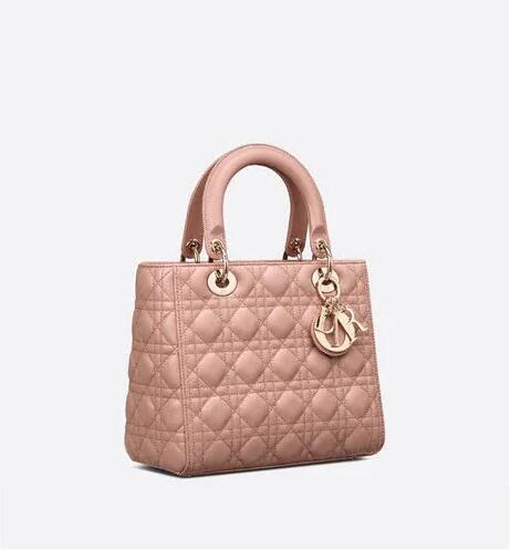 The season's Lady Dior bag embodies Dior's vision of elegance and beauty. The refined creation is timeless yet still very relevant. Crafted in blush lambskin with Cannage stitching. its quilted texture instantly stands out. while the pale gold-finish metal 'D.I.O.R.' charms further embellish the silhouette. The medium style features a thin. removable leather shoulder strap and can be carried by hand. worn over the shoulder or crossbody.