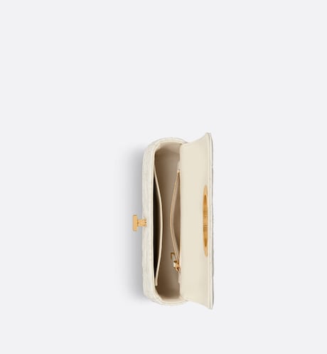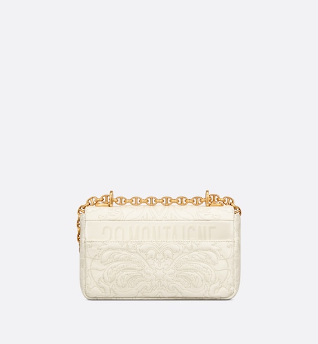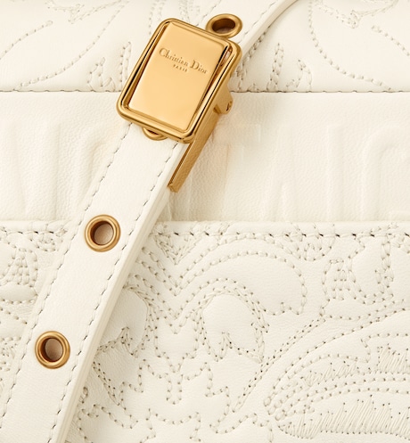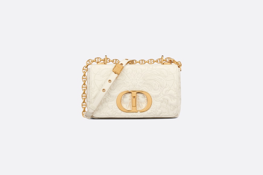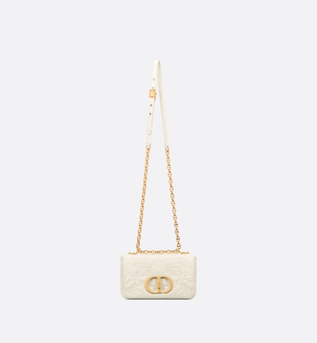 The Dior Caro bag combines modernity with timeless elegance. The design is crafted in latte quilted lambskin revealing the Ornamental motif. inspired by Andalusian baroque in a graphic spirit. The bag features a flap adorned with an antique gold-finish metal 'CD' twist clasp. inspired by the seal of a Christian Dior perfume bottle. The detachable chain shoulder strap with 'CD' signature links allows it to be carried by hand. over the shoulder or crossbody. or replaced by one of the House's wide embroidered straps. allowing the small bag to pair with day or evening attire.
